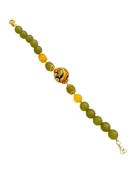 Bracciale elasticizzato che unisce la raffinatezza dell'agata verde e gialla con l'artigianalità di una sfera in ceramica dipinta a mano. Ogni pezzo è unico grazie alla combinazione cromatica esclusiva e alla lavorazione manuale che caratterizza la sfera centrale.