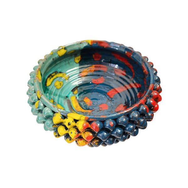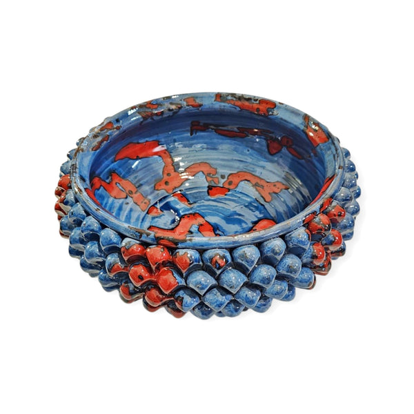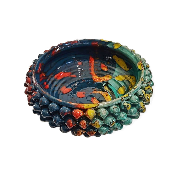 Centrotavola pigna formato da 4- 5 file di piccioli sovrapposti, applicati a mano libera. Le colorazioni sono realizzate tramite la sovrapposizione di 3 diverse infornate che rendono ogni pezzo unico ed irripetibile. Prodotto artigianale realizzato a mano al tornio e dipinto a mano.