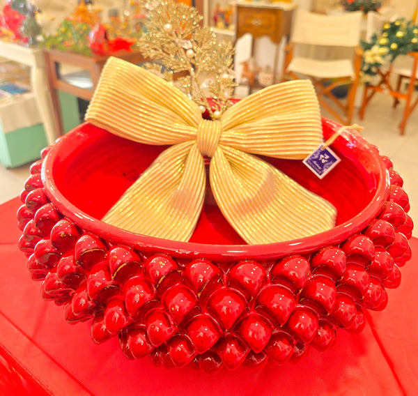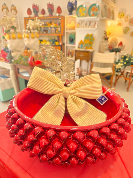 Centrotavola motivo pigna interamente realizzato e dipinto a mano in rosso per Maestranze Siciliane ideale per arredare la tavola.