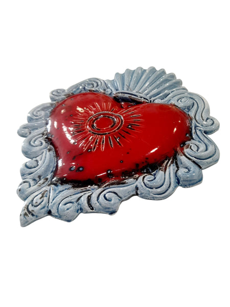 Elegante ex Voto, cuore sacro, in ceramica siciliana celeste chiaro-rosso. Può essere adagiato o appeso al muro.