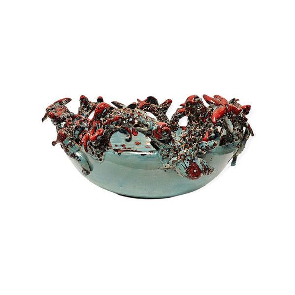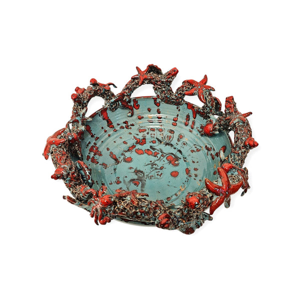Questo grande centrotavola si distingue per il motivo marino che richiama i pesci della barriera corallina, realizzato interamente al tornio e arricchito da raffinate applicazioni. La tecnica al terzo fuoco conferisce alla superficie cromie uniche, rendendo ogni pezzo esclusivo e irripetibile. Perfetto per valorizzare con eleganza e autenticità qualsiasi ambiente, unisce maestria artigianale e suggestioni naturali in un’opera di grande impatto visivo.