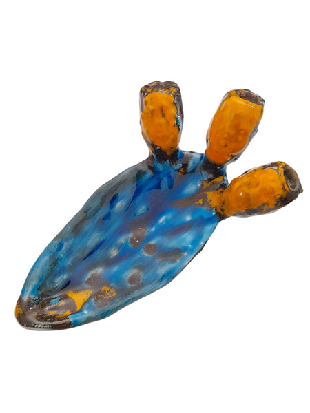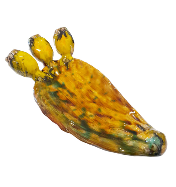 Pala di Fico d'India in ceramica, interamente realizzata e smaltata a mano con l'applicazione di 3 frutti sul bordo. La modellazione a mano la rende un pezzo unico così come il suo colore dato da una particolare tecnica di smaltatura che prevede più cotture ad alte temperature.