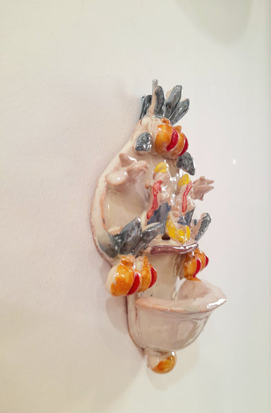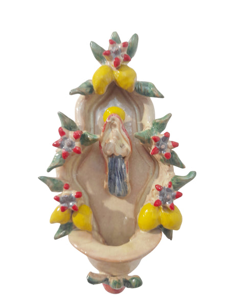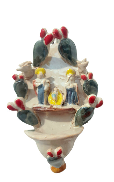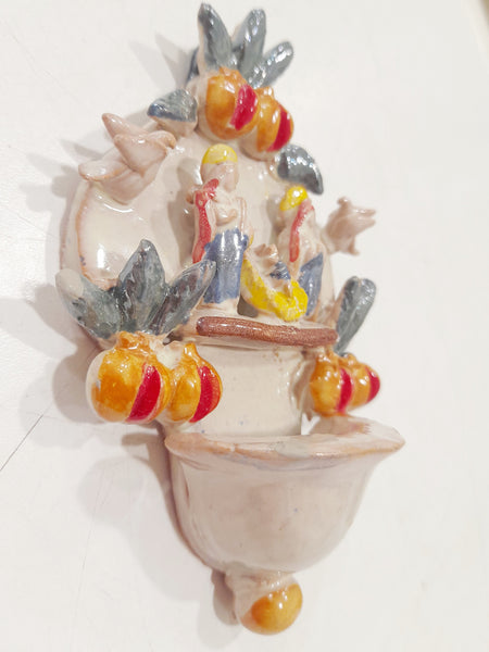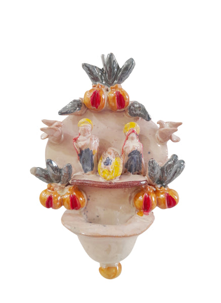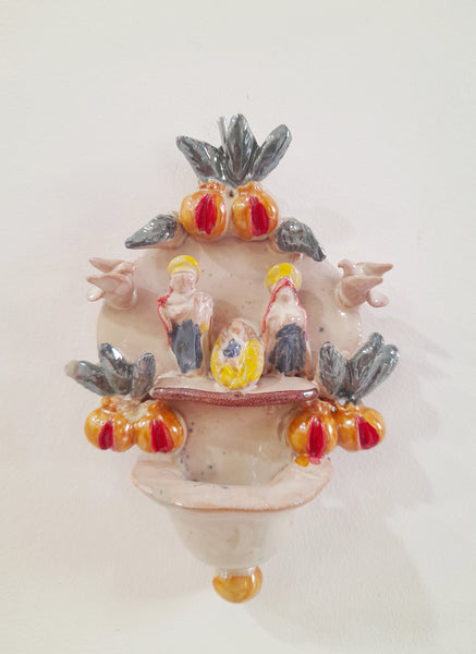 Piccola acquasantiera artigianale interamente realizzata a mano, impreziosita da uno strato di madreperla che genera affascinanti riflessi luminosi. Al centro spicca la Sacra Famiglia, circondata da una ricca cornice decorativa di dettagli simbolici: due colombine incarnano la pace, mentre i melograni rappresentano prosperità. Ogni elemento è sapientemente lavorato per creare un'opera di devozione e bellezza, testimonianza dell'eccellenza dell'artigianato siciliano tradizionale.