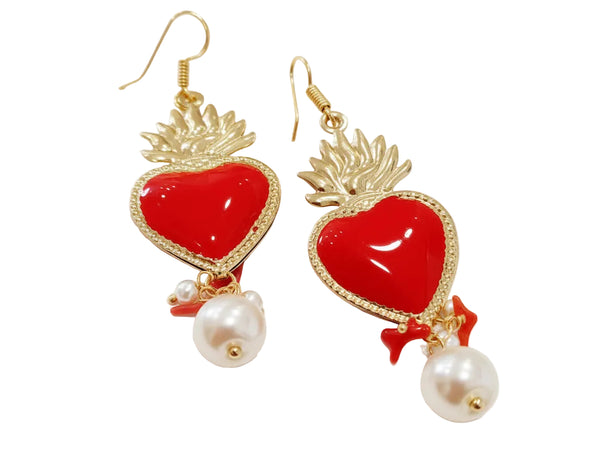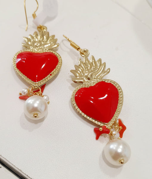 Orecchini tipici siciliani ex voto cuore sacro in metallo dorato smaltato rosso con pendente perla sintetica bianca e perline naturali con frammenti di corallo. Lunghezza orecchini compreso pendente cm 6. Prodotto artigianale realizzato in Sicilia a mano.
