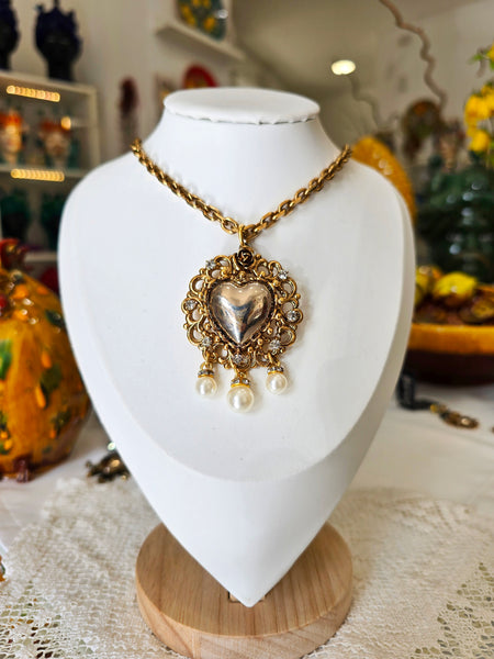 Collana in ottone galvanico dorato che unisce tradizione e raffinatezza. Il ciondolo cuore sacro ex voto bicolore, con dettagli in oro e argento, è arricchito da cristalli scintillanti e tre perle pendenti che conferiscono eleganza e movimento. Un pezzo che celebra la spiritualità con uno stile sofisticato, perfetto per chi apprezza i gioielli carichi di significato e bellezza artigianale.