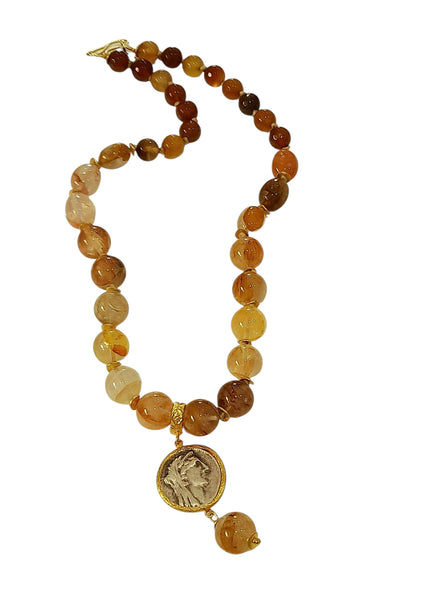 Collana in quarzo dai caldi toni ambrati, valorizzata da un raffinato ciondolo, montata su argento di alta qualità, rappresenta un gioiello unico nel suo genere. Perfetta per chi desidera un accessorio esclusivo che completa con classe ed eleganza ogni outfit.