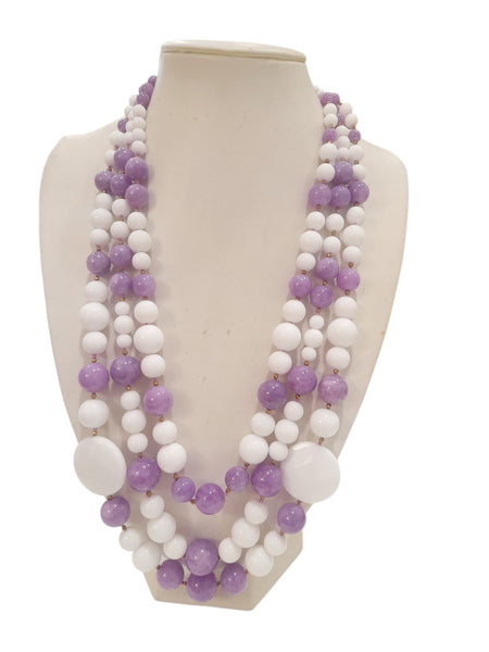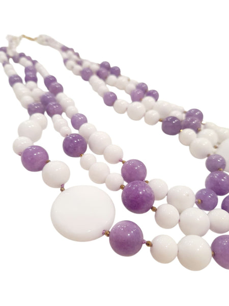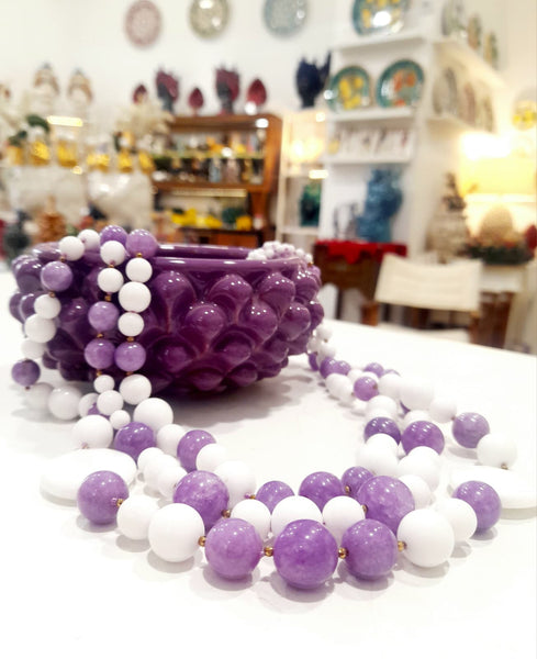 Collana multifilo in agata bianca e lilla, frutto di una meticolosa lavorazione artigianale. Ogni elemento è montato a mano con precisione, creando una composizione sofisticata dove i toni pastello si alternano in perfetto equilibrio. La struttura a tre fili conferisce movimento e profondità, esaltando la naturale bellezza delle pietre. Ideale per cerimonie e momenti importanti. Un accessorio raffinato che valorizza.
