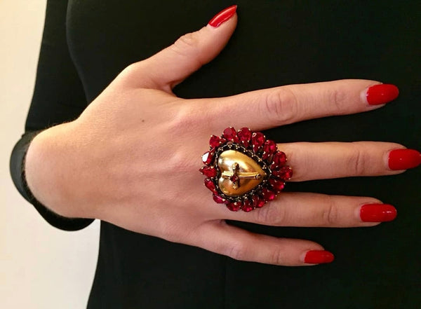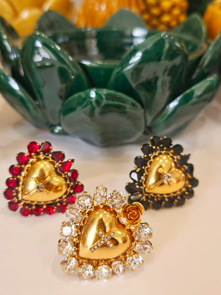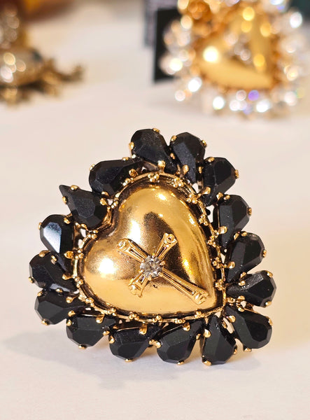 Anello cuore sacro ex voto con cristalli multicolore, realizzato in ottone dorato con finitura pregiata. Al centro spicca una delicata crocetta, simbolo di devozione e protezione spirituale. I cristalli, disponibili in diverse tonalità, catturano la luce creando riflessi affascinanti. La struttura regolabile garantisce una vestibilità confortevole per ogni misura. Creazione esclusiva di Celeste G, disponibile solo presso Maestranze Siciliane. Un pezzo autentico che unisce artigianato siciliano e significato sacro.