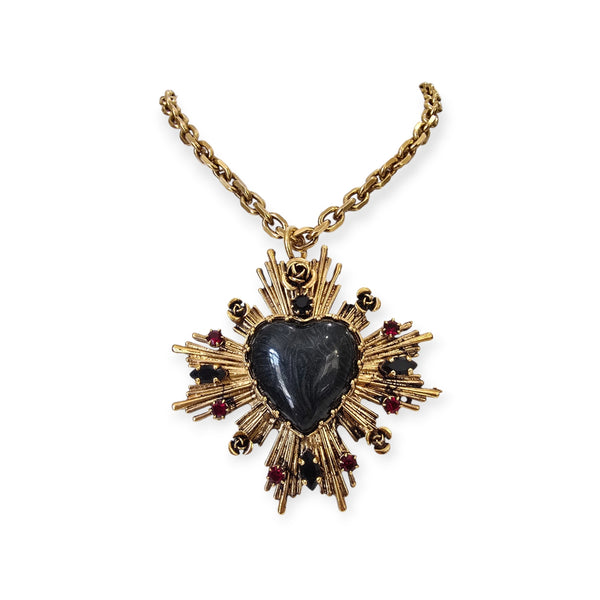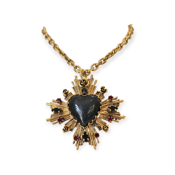 Collana ex voto che unisce tradizione sacra e raffinata artigianalità. Realizzata in ottone con smalto nero fumo, presenta una croce e un cuore sacro impreziositi da una raggiera dorata tempestata di cristalli rossi e neri. Ogni dettaglio riflette la maestria di Celeste G, artigiana che coniuga tecniche tradizionali siciliane con una sensibilità contemporanea. Un gioiello di devozione e stile, esclusiva Maestranze Siciliane, perfetto per chi apprezza l'autenticità del sacro artigianato.
