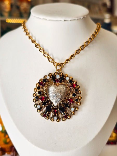 Splendido set di gioielli che unisce tradizione e raffinatezza. La collana e gli orecchini sono realizzati interamente a mano, in ottone galvanico dorato con dettagli in argento e cuori sacri impreziositi da cristalli rossi e neri. Ogni pezzo è una creazione unica, frutto della maestria artigianale. La collana e gli orecchini coordinati garantiscono un'eleganza versatile, perfetti per occasioni speciali o per valorizzare lo stile quotidiano con un tocco di distinzione.