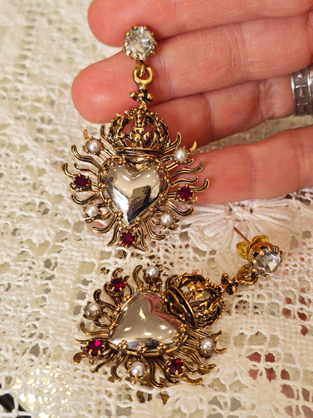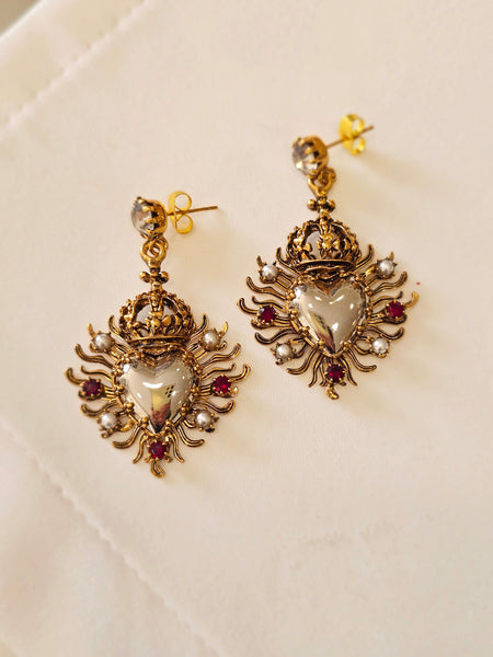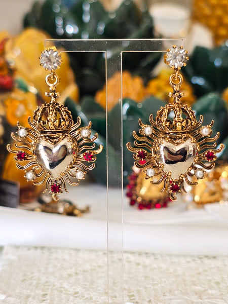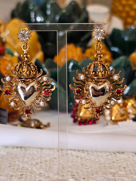 Eleganti orecchini che celebrano la devozione attraverso il simbolo del Sacro Cuore. Realizzati in ottone con finitura dorata e argentata, presentano un design raffinato arricchito da delicati cristalli bianchi e rossi che catturano la luce con eleganza. Perfetti per chi desidera indossare un pezzo di significato spirituale senza compromessi stilistici. Questi orecchini combinano artigianalità tradizionale e dettagli preziosi, rendendoli ideali sia per occasioni speciali che per l'uso quotidiano consapevole. Orecchini collezione Celeste G in esclusiva per Maestranze Siciliane.