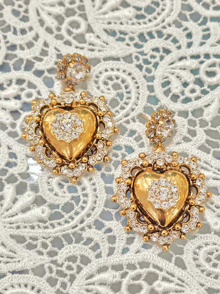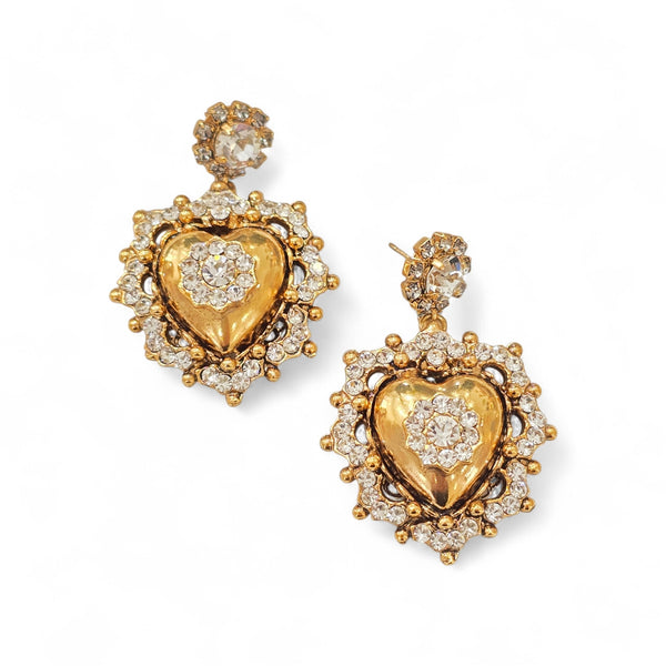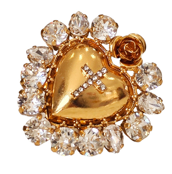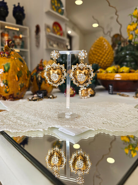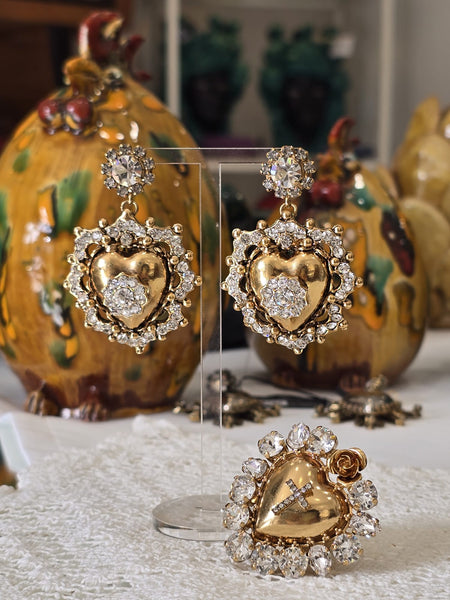 Questo affascinante set di gioielli artigianali celebra la tradizione siciliana del cuore sacro, un simbolo di devozione e protezione. Realizzato in ottone dorato, il design barocco presenta cristalli bianchi brillanti che catturano la luce con eleganza. Gli orecchini e l'anello condividono lo stesso stile raffinato, con una croce centrale che emerge dal cuore e una cornice di cristalli scintillanti sulla lamina dorata. Ogni pezzo è un'opera di maestria artigianale, perfetto per chi apprezza la bellezza della spiritualità siciliana e desidera indossare un ex voto contemporaneo con stile e significato.