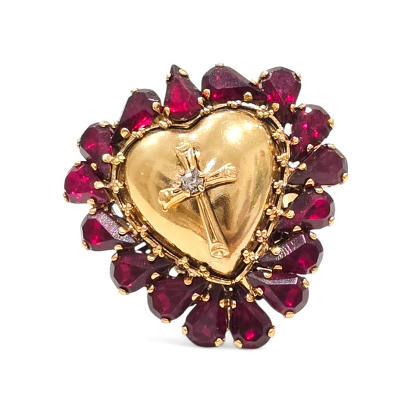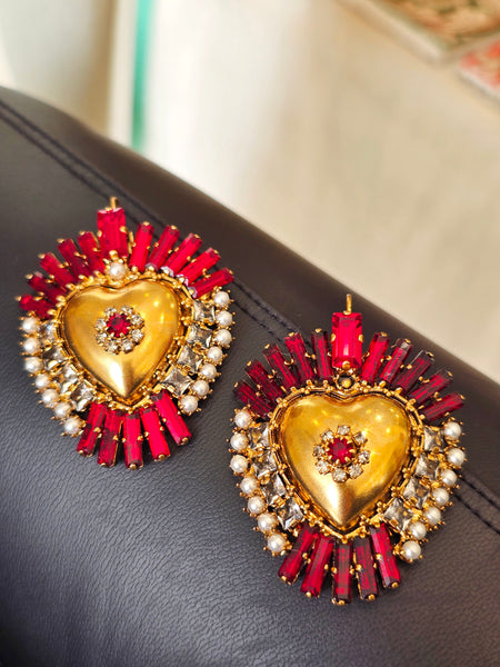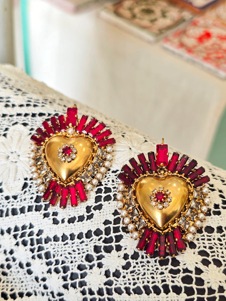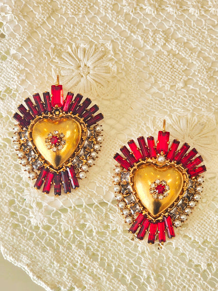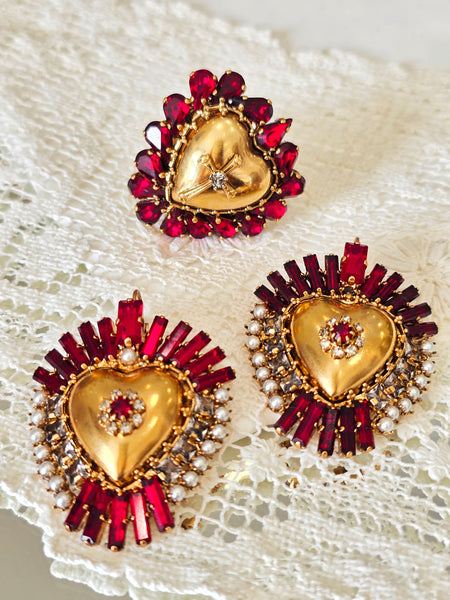 Affascinante collezione di gioielli barocchi siciliani che reinterpreta l'eleganza ottocentesca dell'isola. Realizzati in ottone galvanico dorato, gli orecchini e l'anello presentano il motivo del cuore sacro, simbolo profondamente radicato nella tradizione siciliana. Arricchiti da cristalli rossi , bianchi e perle che catturano la luce con intensità, questi monili coniugano l'autenticità storica con la raffinatezza contemporanea. Ideali per chi apprezza l'artigianato tradizionale e desidera indossare un pezzo che racconta la ricchezza culturale della Sicilia.