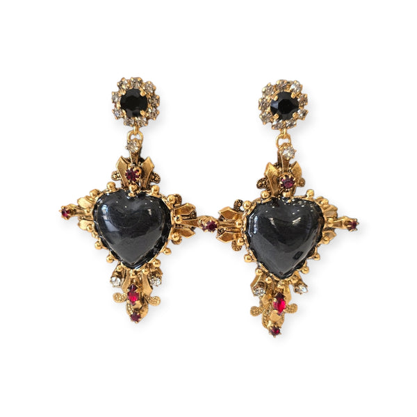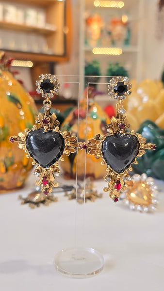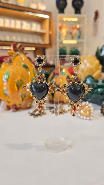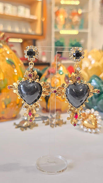 Orecchini siciliani autentici che uniscono tradizione e raffinatezza artigianale. Realizzati in ottone galvanico con finiture oro e argento, presentano una croce ornata da cristalli colorati in rosso, bianco e nero che catturano la luce con eleganza. Al centro spicca un cuore sacro ex voto smaltato con dettagli in madreperla nera fume', simbolo della devozione siciliana. Creazione esclusiva di Celeste G, disponibile solo presso Maestranze Siciliane. Un accessorio che racchiude l'essenza dell'artigianato siciliano autentico.