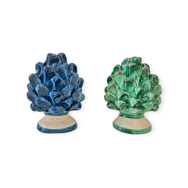 Pigne siciliane in ceramica di Caltagirone interamente forgiate a mano e dipinte a mano. In Sicilia rappresentano un portafortuna per la casa e la famiglia.