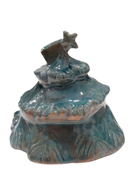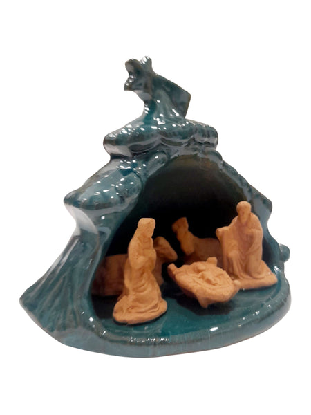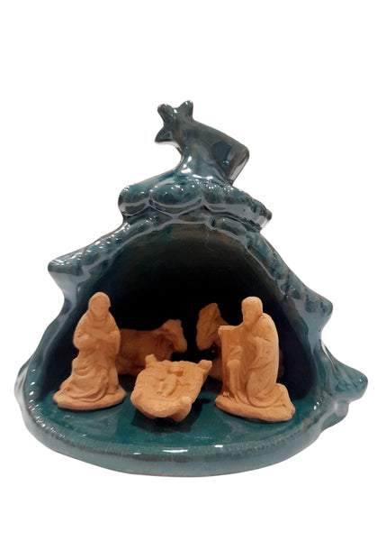 Presepe artigianale realizzato in terracotta, sapientemente inserito all'interno di un albero di Natale smaltato in verde. La composizione crea un affascinante dialogo tra i toni naturali della terracotta e il colore vivido dello smalto, esaltando ogni figura della Natività.