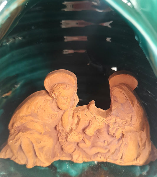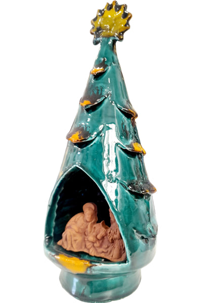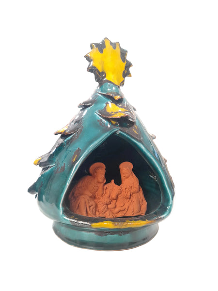 Albero di Natale in ceramica artigianale che racchiude una straordinaria rappresentazione della Natività. La composizione gioca su un raffinato contrasto cromatico: la Sacra Famiglia emerge in terracotta naturale, non dipinta, creando una profondità visiva che risalta in contrasto allo sfondo dell'albero, colorato e decorato. I dettagli in rilievo conferiscono eleganza e tridimensionalità. Un'autentica espressione dell'artigianato siciliano che unisce tradizione religiosa e maestria ceramica.