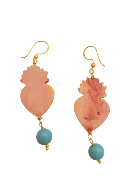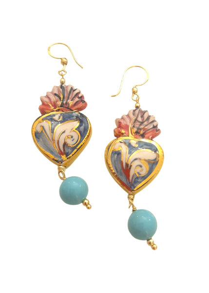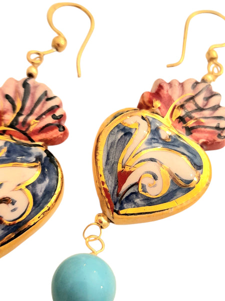Orecchini ex voto dipinti interamente a mano, in ceramica, sono impreziositi da dettagli in oro e da una perla in pasta di turchese. Pezzi artigianali unici, un accessorio elegante e distintivo che valorizza ogni look con autenticità e stile.