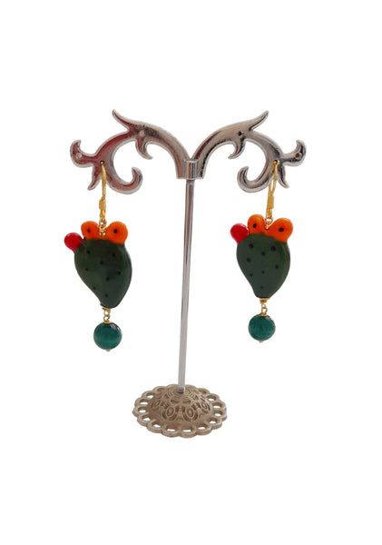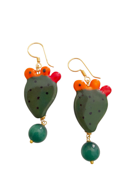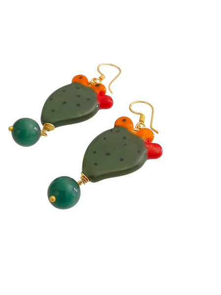 Orecchini Siciliani Fico d'India in ceramica smaltata e perla pendente in agata verde. Gancio a monachella aperta in metallo dorato.