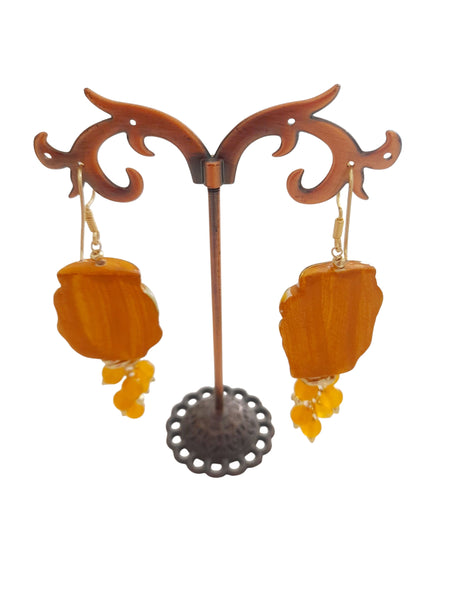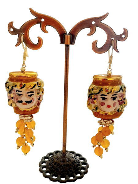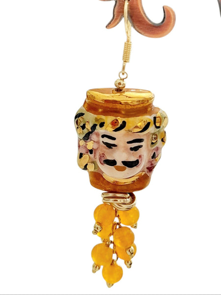 Questi orecchini artigianali rappresentano le iconiche teste di moro della tradizione siciliana, realizzati in ceramica finemente decorata con tecnica al terza fuoco. Presentano infatti dettagli in smalto oro che esaltano la loro raffinata lavorazione, mentre il grappolo di perle in agata gialla conferisce eleganza, movimento e luminosità.