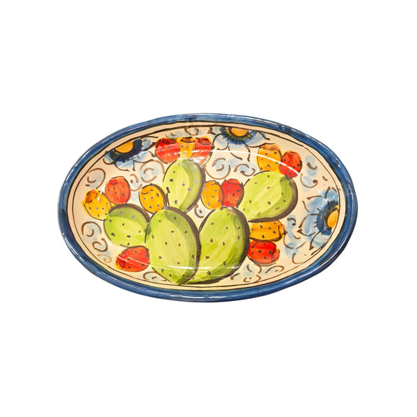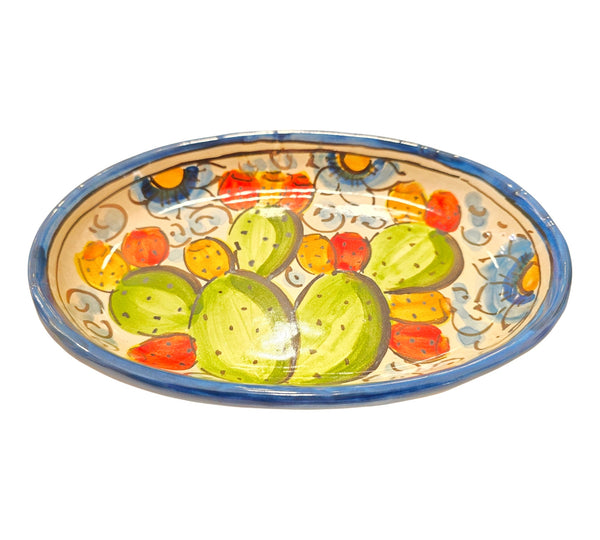 Elegante piatto ovale in ceramica di Caltagirone, realizzato secondo la tradizione artigianale siciliana. Il decoro raffigura il caratteristico fico d'India, simbolo della cultura isolana, eseguito con la tecnica decorativa tipica della ceramica caltagironese. Perfetto per servire pietanze o come pezzo da collezione, combina funzionalità e bellezza estetica. Dimensioni: 23 x 14 cm. Un'autentica espressione dell'artigianato siciliano di qualità.
