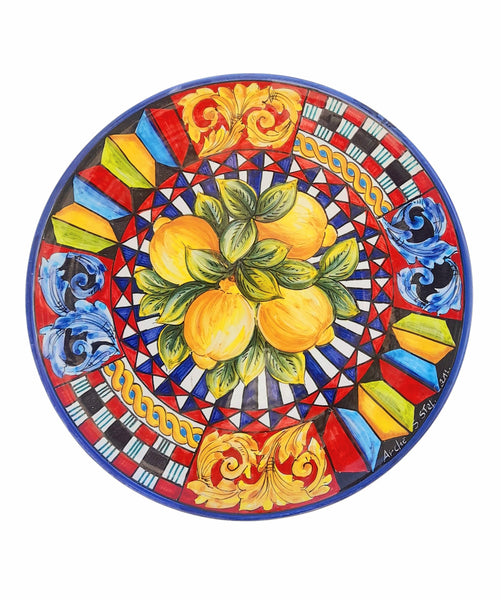 Raffinato ed elegante piatto in ceramica siciliana che rappresenta, nei decori, tipici motivi siciliani: frutti, fichi d'india e testa di moro. Presenta il foro per poter essere appeso al muro oppure può essere appoggiato su sostegno per piatti o usato come centrotavola.