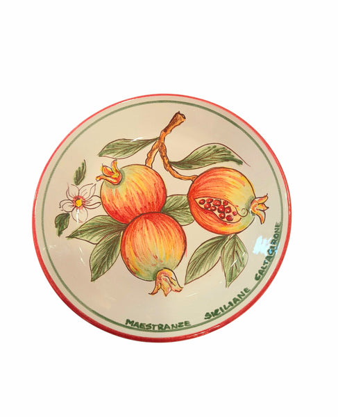 Tipico fagotto siciliano con decoro tralcio di melograno. Il piatto può essere adoperato per servire a tavola oppure può essere appeso al muro per via del foro che reca sul retro.