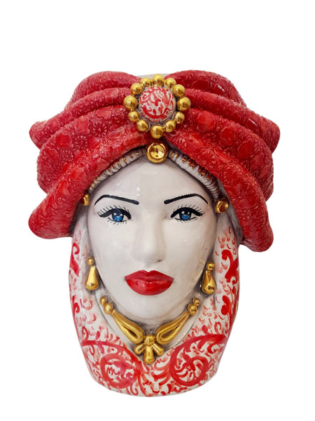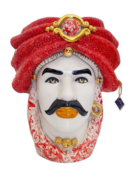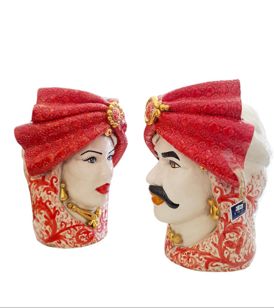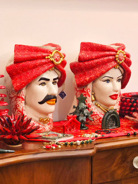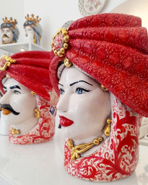Affascinante coppia di Teste di Moro in ceramica di Caltagirone, completamente realizzate e dipinte a mano da artigiani siciliani. I turbanti nei toni del rosso sfoggiano un decoro raffinato che evoca la ricchezza dei tessuti tradizionali dell'isola, con dettagli che richiamano la morbidezza del velluto antico e accenti dorati passati a pennello con oro brillante.
