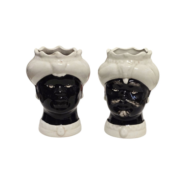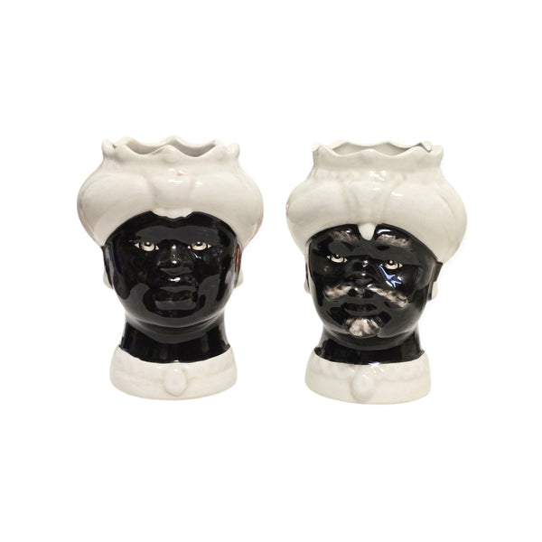 Coppia teste di moro dalla linea molto moderna e delicata rese in monocolore bianco antico e nero lucido ideali per ambienti minimal o per arredamenti contemporanei. Ceramiche artigianali realizzate a mano e dipinte a mano da maestri ceramisti di Caltagirone