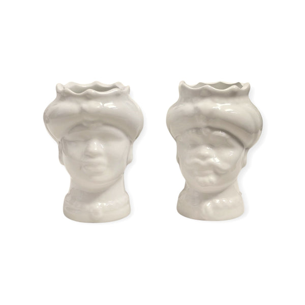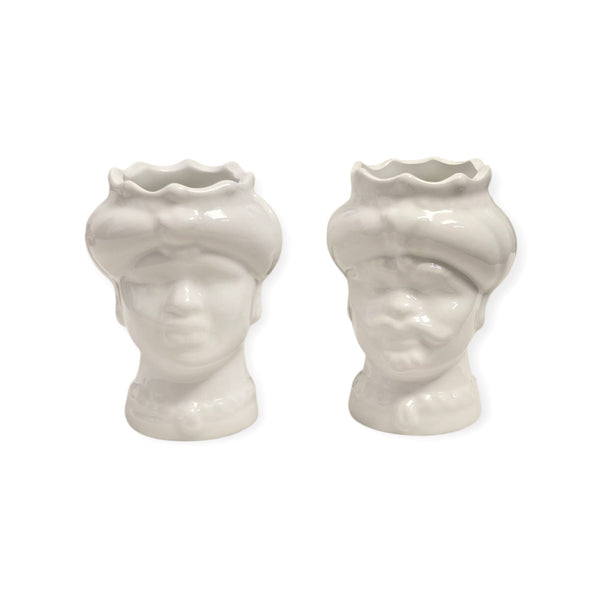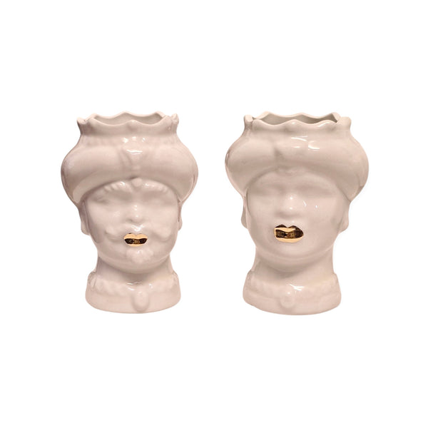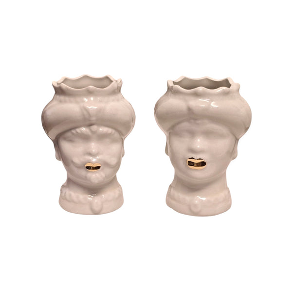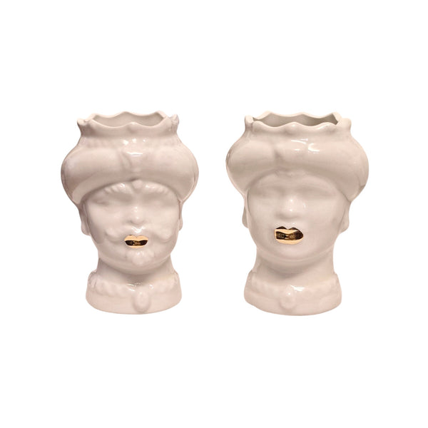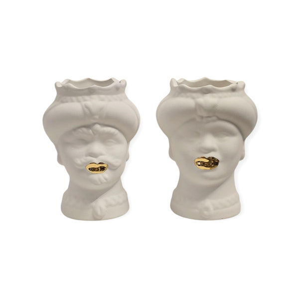 Coppia teste di moro dalla linea molto moderna e delicata rese in monocolore bianco, ideali per ambienti minimal o per arredamenti contemporanei. Tra le varie finiture il lucido e l'opaco con labbra oro
