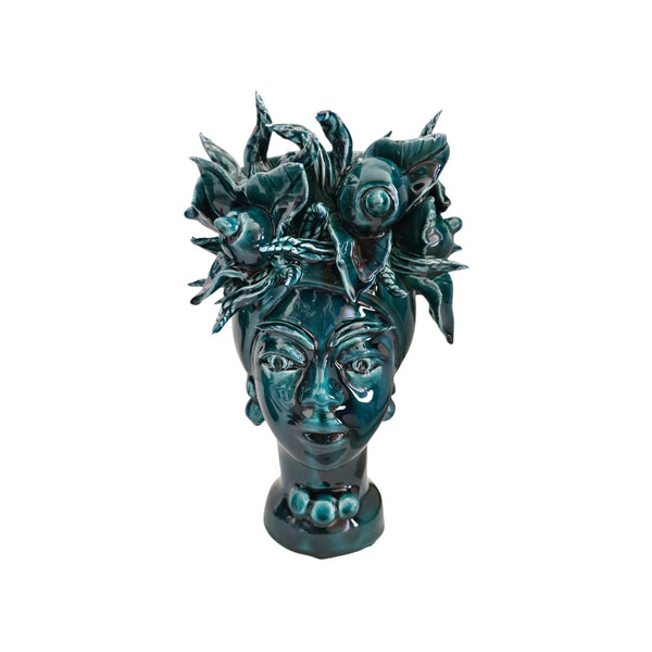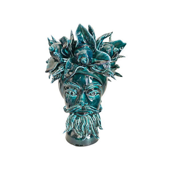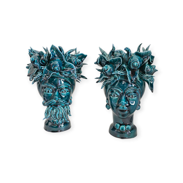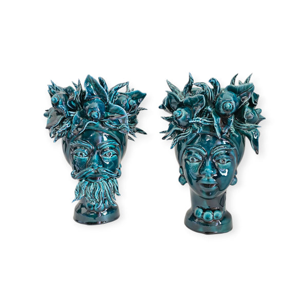 Questa coppia moderna di teste di moro, finemente realizzata e dipinta a mano in verde ottanio, presenta dettagli ispirati alla tradizione siciliana. Perfette per arricchire con stile e raffinatezza qualsiasi ambiente, misurano 25 cm di altezza.