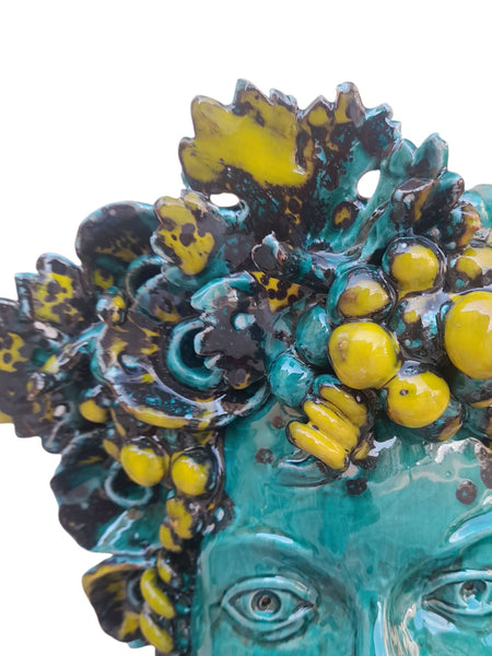 Nella mitologia classica Bacco è il Dio del Vino a cui tutto è concesso. La teste del Dio è un pezzo unico, interamente forgiato e dipinto a mano con tecnica terzo fuoco da illustri artigiani stefanesi.