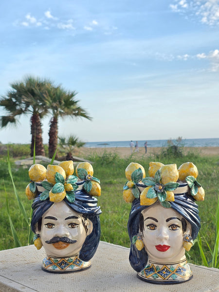 Simbolo di un amore passionale e della rigogliosa fertilità siciliana, questa coppia di teste di Moro in ceramica di Caltagirone, si incorona con l'oro succoso degli agrumi dell'isola, celebrando l'arte e la tradizione delle Maestranze Siciliane.