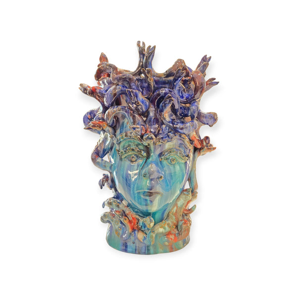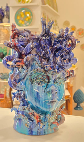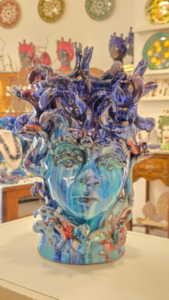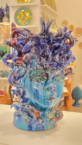 Questo pezzo unico raffigura Medusa, la celebre divinità mitologica capace di pietrificare con lo sguardo. Collocata al centro della Trinacria, simbolo distintivo della Sicilia, rappresenta una delle tre Gorgoni. Con un’altezza di 35 cm e una larghezza di 25 cm, questa opera combina arte e storia, ideale per chi apprezza la mitologia e il patrimonio siciliano.