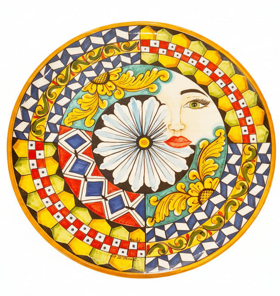 Raffinato ed elegante piatto in ceramica siciliana che rappresenta, nei decori, tipici motivi siciliani: frutti, fichi d'india e testa di moro. Presenta il foro per poter essere appeso al muro oppure può essere appoggiato su sostegno per piatti o usato come centrotavola.