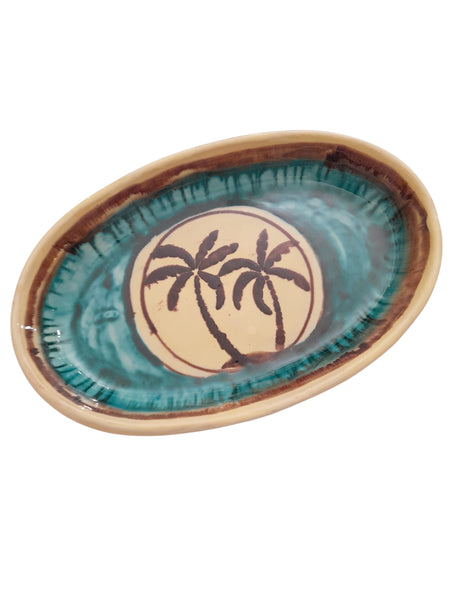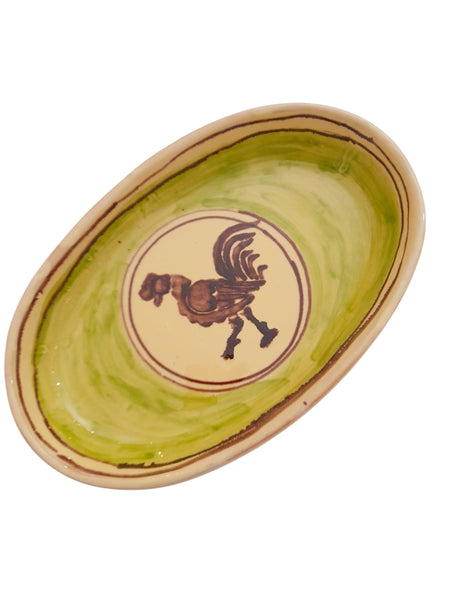 Piatto Ovale in vari colori con colature e decoro floreale tipico della macchia mediterranea o con motivo animale, es. galletto o uccellino. Si può adoperare per servire a tavola succulente ricette o anche come centrotavola o come piatto decorativo avendo i fori per essere appeso al muro.